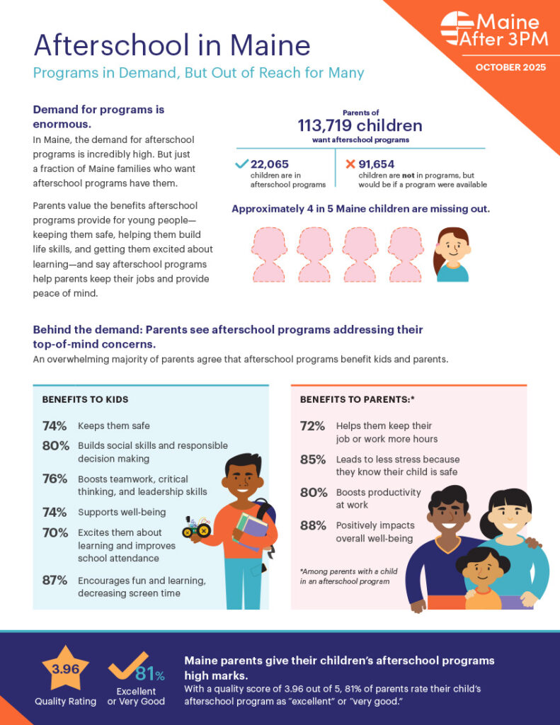 Demand for programs is enormous. In Maine, the demand for afterschool programs is incredibly high. But just a fraction of Maine families who want afterschool programs have them. Parents value the benefits afterschool programs provide for young people—keeping them safe, helping them build life skills, and getting them excited about learning—and say afterschool programs help parents keep their jobs and provide peace of mind. For every one child in an afterschool program in Maine 4 are waiting to get in.